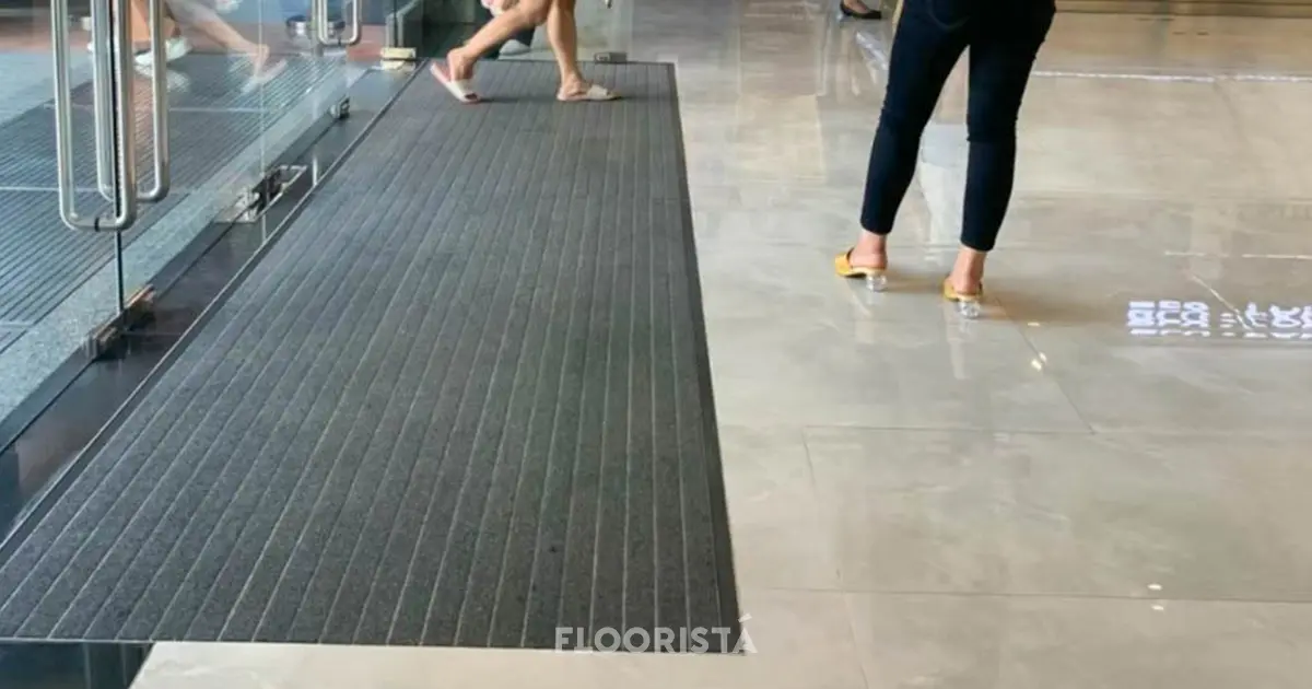 installVinyl Gray terrazzo pattern alternating with white patterns along the walkway inside the shopping center. Central Rama 2